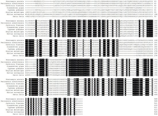 The full-length cDNA of S. scutate CYP (GenBank accession no. KM104864) was 1829 bp, consisting of a 27 bp 5′ untranslated region, a 272 bp 3′ untranslated region, and a 1529 bp open reading frame encoding 509 amino acids (Figure 2). The theoretical isoelectric point and the predicted molecular mass of this deduced protein were 4.96 and 149,744 Da, respectively. SignalP-4.1 analysis showed that it had no obvious signal peptide sites, which might make it a non-secretory protein. The 2nd to 24th amino acids of the CYP protein formed an obvious transmembrane region, suggesting that it might act as a membrane receptor. The maximum hydrophobicity of amino acids was 3.61, and the minimum was −3.99, with the mean of −0.265. It was further inferred that the protein was hydrophilic.