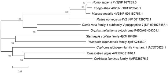 The CYP4 sequence was submitted to NCBI (No:KM104864), and the similarity was compared using online Blast. The results showed that the amino acid sequence of the CYP4 gene had 58% similarity with Nereis aibuhitensis CYP4V subfamily gene (JQ867402), 29% and 31% similarity with Alitta virens CYP4BB1 and CYP342A1, and 35% similarity with Capitella capitata CYP4AT1. The amino acid sequence showed similarity with mollusks Crassostrea gigas CYP4V2, Cyphoma gibbosum CYP4V1, Corbicula fluminea CYP4, Danio rerio CYP4V7, and Oryzias melastigma CYP4 and mammals Homo sapiens CYP4V2, Pongo abelii CYP4V2, Macaca mulatta CYP4V2, and Rattus norvegicus CYP4V2 was 51–57%. The amino acid sequence of CYP4 was compared with the GenBank database, and the similarity was analyzed by Clustal W (Figure 4). The NJ method was used to construct a homology tree with a bootstrapping value of 1000 (Figure 5). In summary, we speculated that the CYP4 gene was a new member of CYP4V subfamily, which was tentatively named SsCYP4V.