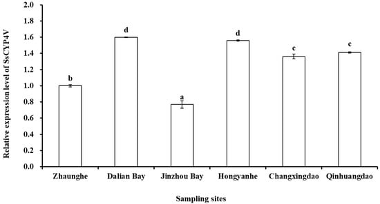 The relative expression of SsCYP4V gene of S. sculata was significantly different in the sampling sediments (F = 569.58, p < 0.001, Figure 6). The relative expression of the SsCYP4V gene of S. scutata in Jinzhou Bay was significantly lower than that in other sites (p < 0.05), and the relative expression of the SsCYP4V gene of S. scutata in Zhuanghe was significantly higher than that in Jinzhou Bay (p < 0.05). The relative expression of the SsCYP4V gene of S. scutata in Changxingdao and Qinhuangdao was significantly higher than that in Zhuanghe (p < 0.05), but there was no significant difference between the two sampling sites (p = 0.161). Meanwhile, the relative expression in Dalian Bay and Hongyanhe was significantly higher than that in other sites (p < 0.05), but there was no significant difference between the two sampling sites (p = 0.383).