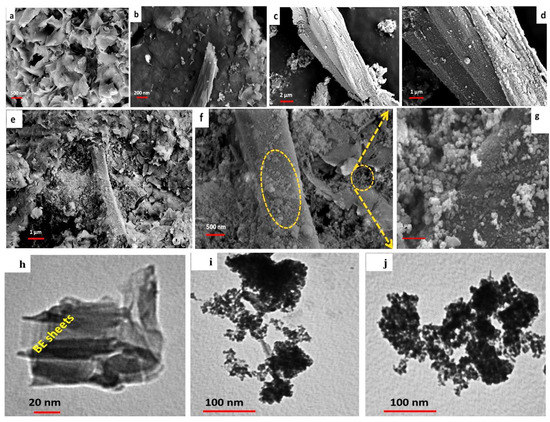 Characterization of the studied samples: FESEM images of BE (a), BE/SD (b–d), BE/SD–MNPs (e–g), TEM images of BE (h), and BE/SD–MNPs (i,j).