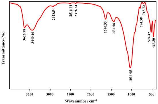 An FTIR spectrum of the developed BE/SD–MNPs composite is shown in Figure 3. The detected band at 3626.78 cm−1 could be assigned to the hydroxyl groups (–OH) of the octahedral cations, particularly Al3+ [30]. The observed band at 3440.10 cm−1 is related to the –OH groups of the mechanically held water molecules [31]. The peak detected at 2928.54 cm−1 is attributed to the –CH2 stretching of the aliphatic compound [19]. The characteristic band at 2365 cm−1 may correspond to an N–H stretching vibration [32]. The detected peak at 1640.53 cm−1 could be associated with the bending vibration mode of the attached water molecules [30]. The band located at 1434.06 cm−1 could be attributed to Si–O or Al–O groups of the BE sample [18]. The Si–O bending vibration was detected at 1036.59 cm−1, while the stretching vibration was observed at 713.72 cm−1 [33]. The visible bands at 601.67 and 466.30 cm−1 can be associated with the Fe–O vibrational modes, while the band observed at 564.72 cm−1 was attributed to Fe–O stretch vibrations of Fe3O4 nanoparticles [5]. Thus, detecting these bands supported the modification of BE/SD by magnetic Fe3O4 nanoparticles producing multifunctional BE/SD–MNPs composite.