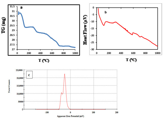 TGA (a), DSC (b), and zeta potential (c) results of BE/SD–MNPs.