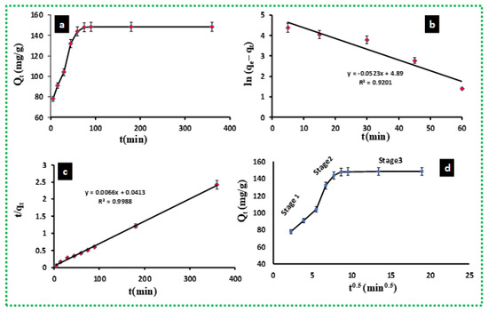 Effect of contact time (a), the pseudo-first-order (b), the pseudo-second-order (c), and intra-particle diffusion (d) equations associated with the adsorption of MB on BE/SD–MNPs. Operating conditions: 25 mg of BE/SD– MNPs mass, 25 mL of M.B. solution (150 mg/L), 25 °C of adsorption temperature, and solution pH 8.0.