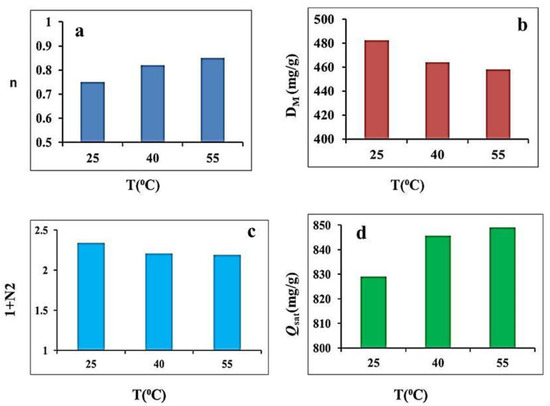 Determination of the adsorption capacity at saturation [Qsat = n. DM (1 + N2)] is a vital issue for evaluating the uptake efficiency of the BE/SD–MNPs adsorbent for capturing MB molecules. The Qsat values were 829.10, 845.75, and 848.99 mg/g at temperatures of 25, 40, and 55 °C, respectively. (Table 5 and Figure 7). The increase of the Qsat values with temperature supported the endothermic interaction between the MB molecules and BE/SD–MNPs. The values of Qsat displayed the same style presented by the n parameters (i.e., the N2 and DM parameters increased with temperature). (Table 5). This behavior suggested that the steric n parameter mainly controlled the BE/SD–MNPs adsorption performance. Similar results were reported in our previous study [28]. Furthermore, if it was expected that N2 = zero, the results of n. DM presented very similar values to the monolayer adsorption model, reinforcing the correspondence between the experimental and theoretical adsorption data.
