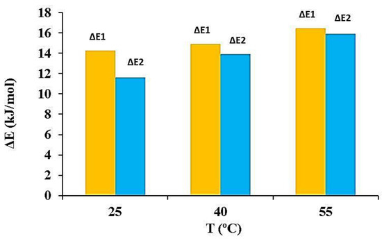 The selected model (M3) suggests the existence of two adsorption energies (ΔE1 and ΔE2) that can be involved in MB adsorption on the BE/SD–MNPs active sites. The values of (ΔE1 and ΔE2) were determined by Equations (19) and (20) as follows [2,17,45]: