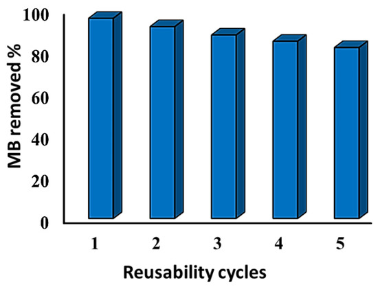 After all the regeneration runs, the as-prepared BE/SD–MNPs composite presented removal percentages [%] above 85% for MB (Figure 10). The slight decrease in sorption capacities can be related to two possible factors: (i) some amounts of MB dye could not be desorbed (i.e., irreversible uptake); and (ii) slow removal of porosity and surface chemistry upon processing [21]. Therefore, the BE/SD–MNPs adsorbent can be recycled many times by removing MB dye without a significant loss in its uptake efficiency, representing the high stability and recyclability of the BE/SD–MNPs composite in industrial systems.