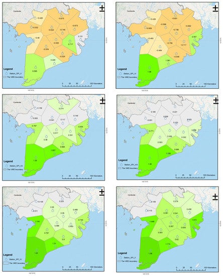 The drought index enables drought monitoring at multiple timescales. The monthly distribution of rainfall was assessed, which is useful for agricultural water management. Figure 5 depicts the monthly distribution of rainfall deficit in the VMD.