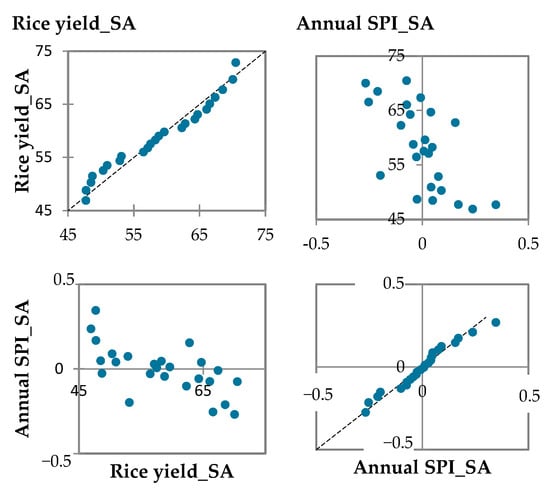 The very slight drought, as well as very slight wet conditions, are seen to be a common occurrence in the VMD. However, very slight drought occurs more often, and the affected area in both seasons is also spatially larger than that in the very slight wet conditions. In general, the SA rice cropping season showed wet conditions more frequently than the WS rice cropping season, whereas the WS rice cropping season experienced drought conditions more frequently than the SA season. It should be noted that the higher positive SPI indicates more rain in the SA rice cropping season, which could affect rice yield. Therefore, the Pearson correlation was used to identify the relationship between SPI indices and saline water intrusion with rice yield, as is shown in Figure 7.