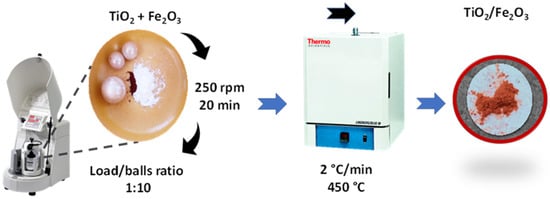 Synthesis of TiO2/Fe2O3 composites. The TiO2/Fe2O3 composite was obtained by mechanosynthesis; 0.1 mol of TiO2 phase anatase, previously obtained by the sol-gel method and according to a procedure reported by Estrada-Flores et al., was placed into a container of zirconia of 200 mL; then, it was mixed with 2% in mol of Fe2O3 []. The container was placed in a Fritsch planetary ball mill (model Pulverisette 6), and the mixture was left in stirring for 20 min at 250 rpm. After this time, a red powder was obtained, which was subjected to a thermal treatment at 450 °C, using a heating rate of 2 °C/min. The ball load ratio was 1:10. Figure 1 presents a diagram of this synthesis procedure.