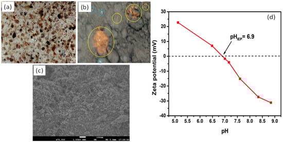 (a) and (b) Optical micrographs at 500 X of Clay-K and BFS samples, respectively; (c) micrograph (SEM) at 75000X of the TiO2/Fe2O3 sample. (d) Zeta potential of the TiO2/Fe2O3 sample as a function of pH.