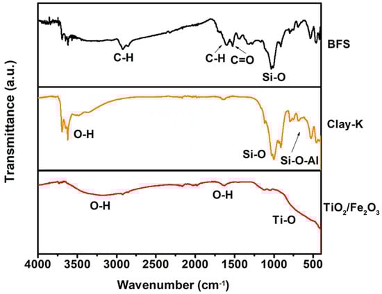 The chemical and structural characterizations of the TiO2/Fe2O3, Clay-K, and BFS samples were performed by infrared spectroscopy and X-ray diffraction. Figure 3 shows the infrared spectra of each of the samples. The infrared spectrum of the BFS sample presents absorption bands characteristic of the C-H bond stretching, which are at 2900 cm−1 and the vibrations of the C-H and C=O bond at 1560 cm−1, respectively; these absorption bands may be associated with the carbon present in this sample. An absorption band is also observed at 1030 cm−1 corresponding to the Si-O stretch, as well as other less intense absorption bands at lower values, which may be associated with the vibration of the M-O bond where M represents Si and Fe since this sample contains mainly silicon oxide and iron oxides in lesser amounts. The absorption bands at values less than 999 cm−1 that have been associated with the Si-O-Al bond of aluminosilicates are also observed.