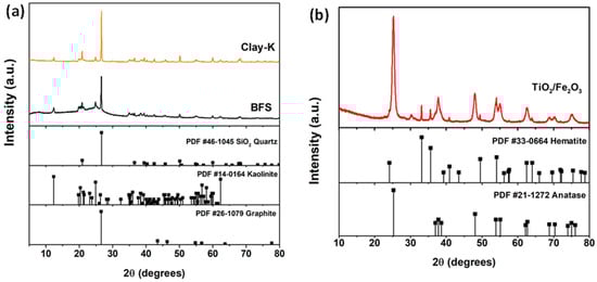 X-ray diffractograms of (a) BFS and Clay-K samples and of (b) TiO2/Fe2O3 sample. Diffraction patterns of quartz (PDF # 46-1045), (kaolinite (PDF # 14-0164), graphite (PDF # 26-1079), anatase (PDF 21-1272), and hematite (PDF 33-0664) are included.