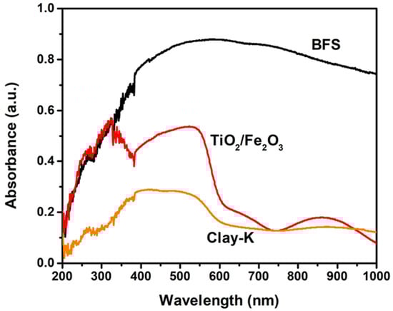 Absorption spectra of Clay-K, BFS, and TiO2/Fe2O3 materials.