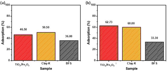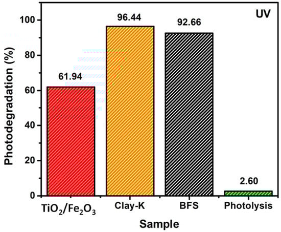 By contrast, the results of the characterization by the BET technique indicate that the values of the specific surface area (ABET) of Clay-K, BFS, and TiO2/Fe2O3 samples are 14.93 m2/g, 5.69 m2/g, and 66.59 m2/g, respectively.