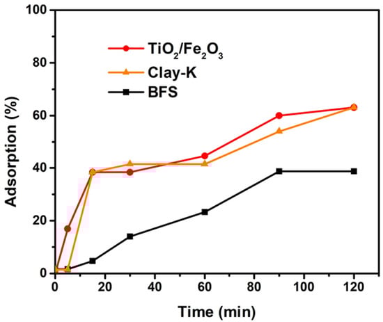Contrastingly, the results of cyanide adsorption in the three materials as a function of time at the initial NaCN concentration of 750 ppm are shown in Figure 7; it is observed that within 15 min of being in contact with the Clay-K and TiO2/Fe2O3 materials into cyanide solution, 40% adsorption is reached, while the BFS material only adsorbs 4.6% cyanide. At 120 min this same sample only adsorbs 38.76%, whereas Clay-K and TiO2/Fe2O3 samples adsorb up to 63%.