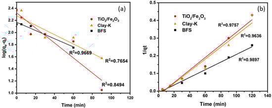 Modeling of cyanide adsorption kinetics in TiO2/Fe2O3, Clay-K, and BFS samples. (a) Pseudo first order and (b) Pseudo second order model.