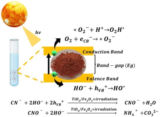 It has also been suggested that iron oxides may add benefits when they are used in conjunction with TiO2 for cyanide removal [,,]. The photocatalytic activity of iron oxides is well known, and they have been used to promote the oxidation of pollutants in ozonation processes, taking advantage of their stability and low cost []. Eskandari et al. conducted an experiment of cyanide adsorption and cyanide photo-degradation with UV light. In this study, two different materials based on TiO2 and Fe2O3 (TiO2/Fe2O3/zeolite and TiO2/Fe2O3/PAC) were used; the authors also used H2O2 as an additional oxidant. Under the best set of conditions of this study, cyanide degradation was higher than 90% for both catalysts, with the TiO2/Fe2O3/PAC catalyst showing a slightly better performance (97% cyanide removal) [].