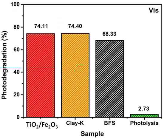 Using visible light as an excitation source (Figure 11), TiO2/Fe2O3 material has a higher percentage of degradation (74.11%) compared to that obtained with UV irradiation (61.94%). In contrast, the BFS and Clay-K materials photodegraded in a smaller percentage to cyanide, obtaining values of 74.40% and 68.33%, respectively; compared to the results obtained using irradiation with UV light, these two materials have about 30% less catalytic action under irradiation with visible light. These results indicate that the TiO2/Fe2O3 material can be used as a catalyst for cyanide photo-oxidation under visible irradiation. This same Figure 10 includes the photolysis of a cyanide solution of 750 mg/L irradiated with visible light for 2 h, obtaining 2.73% of photodegradation.