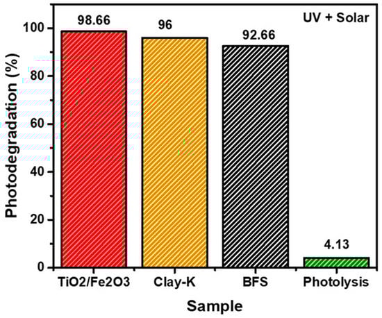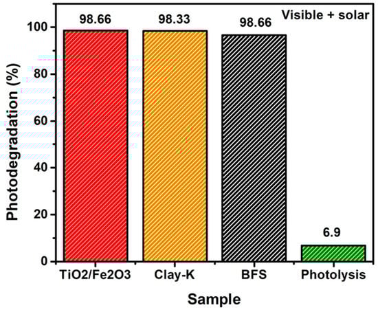 The results obtained with visible radiation plus solar irradiation are shown in Figure 13. In this case, the cyanide photodegradation values with the three materials were 98.66%, 98.33%, and 98.66% with the materials TiO2/Fe2O3, Clay-K, and BFS, respectively. This indicates that natural sunlight composed of different types of radiation (visible, UV, and infrared) allows to generate different levels of excitation; according to Mathew et al. (2021), infrared (IR) irradiating over oxide catalysts permit to improve or facilitate the evolution of gases as O2 [] that contribute to the oxidation of cyanide. All three materials are highly efficient to photodegrading cyanide under this irradiation scheme. This same figure includes the photolysis of a cyanide solution of 750 mg/L irradiated with visible and natural sunlight for 2 h, obtaining 6.9% photodegradation.