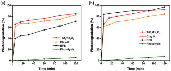 Figure 14a presents the photodegradation results obtained by subjecting the cyanide-catalyst suspensions with a solar irradiance of 400 to 600 W/m2 for two hours. At two hours of irradiation, the samples of TiO2/Fe2O3 and Clay-K allow 84% and 82% of cyanide photodegradation, respectively, while the BFS sample photodegrades 72%. Comparing these results with those obtained with greater irradiation, it can be said that the greater the irradiation the photocatalytic activity of the three catalysts increases and that the photocatalytic activity of the residue is more dependent on the intensity of irradiation than the Clay-K and TiO2/Fe2O3 samples. As for the effect of solar irradiation time on cyanide photodegradation with the three catalysts and for both solar irradiation ranges, it is observed that the photodegradation rate is considerably higher in the first 30 min; even more, after this time, photodegradation continues to increase but at a lower rate, meaning that it is less dependent on irradiation time. Eskandari et al. reported that the longer the irradiation time the system has, the more reaction time there will be between the photocatalyst and cyanide, achieving a greater photodegradation of contaminants [].
