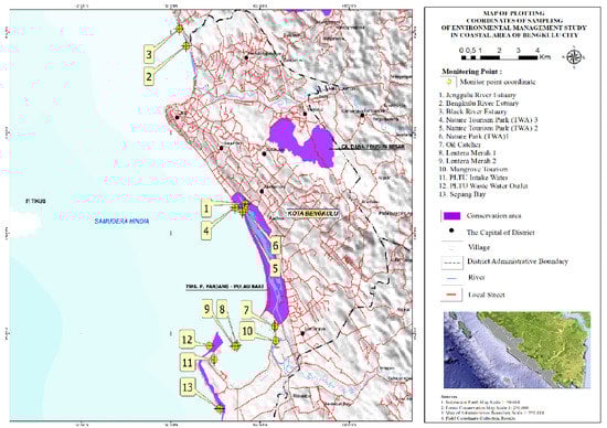 The city of Bengkulu is located in the southwest part of Sumatra Island, which borders the provinces of West Sumatra, Jambi, South Sumatra, and Lampung. Bengkulu consists of coastal areas (71.87%), rivers, and estuaries, and it is an area with enormous potential for mangrove ecosystems. Its location is directly opposite the Indian Ocean; therefore, the coastal area of Bengkulu also has a high potential for abrasion due to large waves and rising sea levels []. In addition, researchers have observed accretion due to sedimentation along the coast of Bengkulu []. As the capital of the province of Bengkulu, the coastal areas of the city of Bengkulu are also under tremendous pressure due to infrastructure development and overexploitation, inducing ecological change due to the imbalance between the carrying capacity and the utilization of the coastal zone []. This pressure increases the susceptibility of the coastal areas of the city of Bengkulu, particularly if they are not sustainably managed []. Recently, researchers proved that periodic underwater breakwaters could be used to protect coastal areas and maintain mangrove ecosystems that face extremely high waves [].