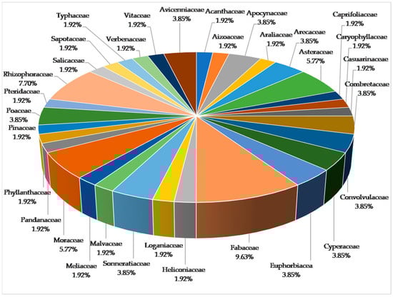 The Rhizophoraceae and Fabaceae families had the highest percentages of all the species identified in the study area (Figure 2). The Rhizhophoraceae family in the study area consisted of five species: B. gymnorhiza; R. mucronata; R. apiculata; R. stylosa; C. multiflora. The Fabaceae family also consisted of five species: E. cyclocarpum; Acacia sp.; B. purpurea; D. tortuosum; L. leucocephala.