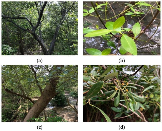 Avicennia sp. in Bengkulu: (a) branches of A. alba; (b) leaves of A. alba; (c) branches of A. marina; (d) leaves and flowers of A. marina.