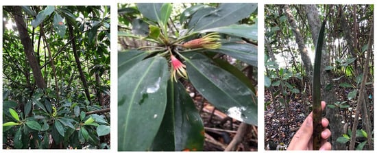 - Duke, N.; Kathiresan, K.; Salmo, S.G., III; Fernando, E.S.; Peras, J.R.; Sukardjo, S.; Miyagi, T. Bruguiera gymnorhiza. In The IUCN Red List of Threatened Species 2010; e.T178803A7610926; IUCN: Gland, Switzerland, 2010. [Google Scholar]