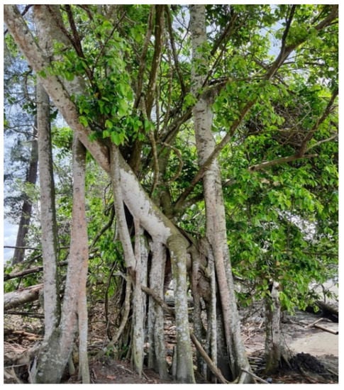 We found widespread C. equisetifolia, locally known as cemara udang (Figure 9), at almost all the research sites, except for Sites 5–7 and 11. We found this species in large amounts at Sites 1–3, and 12. This species grows well in tidal areas, especially in back and open areas, and it can live in areas with many disturbances. The leaves are small, cylindrical, and scaly, and the tips are needle-like. The leaves are thick and sharp and can be shaped as desired. The stems are covered with stiff coarse-textured bark (Figure 9). The snaking branches induce a beautiful shape, and the trunks run from reddish brown to grey. Usually, C. equisetifolia is associated with Hibiscus tiliaceus.