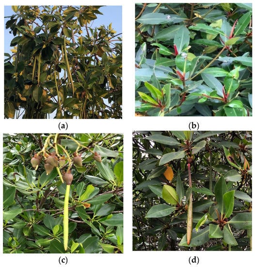 (a) Fruit of R. mucronata; (b) leaf of R. apiculata; (c) fruit of R. stylosa; (d) fruit of R. apiculata.