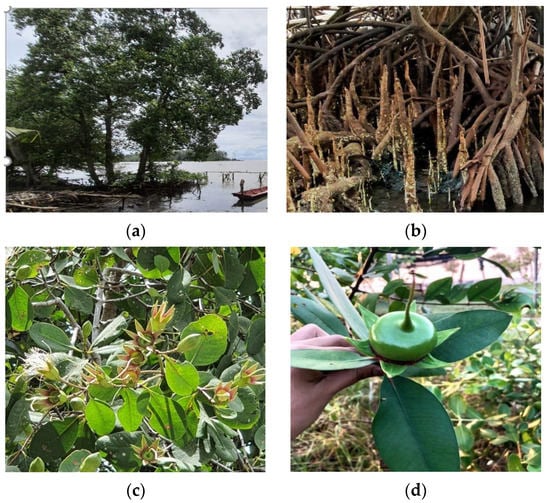 (a) S. alba at the estuary of Jenggalu River; (b) conical respiratory roots of Sonneratia sp.; (c) flower of S. alba; (d) fruit of S. caseolaris.