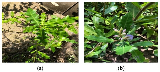 A. ilicifolius, also known as Jeruju, is a low perennial shrub that grows in groups on riverbanks and tidal areas, low wetlands, and mangrove forests. The leaves of A. ilicifolius are elongated, the bases and tips are pointed, and the edges of the leaves are jagged and have thorns (Figure 8a). The flowers of A. ilicifolius have a bluish-purple crown, with a flower bunch length of 10–20 cm and a flower length of 5–4 cm (Figure 8b). We only found Acanthus ilicifolius in small amounts at Sites 8 and 9.
