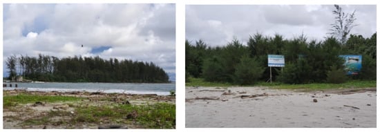 The protection and rehabilitation of the mangrove ecosystem are also important, considering its role as a natural barrier that can protect coastal areas from various disasters, including large waves and abrasion. Multiple parties have initiated various initiatives to rehabilitate the mangrove ecosystem in the city of Bengkulu, including government agencies, nongovernmental organizations (NGOs), and the local community []. These rehabilitation efforts were estimated to substantially impact the 54.45 ha increase in the mangrove area in the city of Bengkulu from 2010 to 2021. Mangrove rehabilitation activities in Bengkulu have been taking place since 2011. In 2013, these initiatives included planting more than 1000 mangroves in a five-hectare tidal land area, comprising two hectares in TWA Pantai Panjang and three hectares in Pondok Besi, through the collaboration between the local community and Natural Resources Conservation Center (BKSDA) of Bengkulu []. Furthermore, in 2018, the Bengkulu Naval Base (Lanal), in collaboration with the Mukomuko Regency Government, prepared 1500 mangrove trunks for mangrove rehabilitation activities in Bengkulu []. In 2020, the mangrove rehabilitation activities in the province of Bengkulu, including the coastal city of Bengkulu, targeted (Pantai Panjang Natural Tourism Park) an area covering 50 hectares.