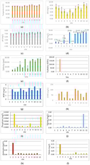 The water quality in the mangrove and coastal ecosystems was relatively good, with temperatures between 29 and 33 °C (Figure 10a), dissolved oxygen contents of 2.9–9.5 mg/L (Figure 10b), pH values of 7–8 (Figure 10c), TDS values of 0–25 g/L (Figure 10d), and salinities of 2–27 ppt (Figure 10e). We found the lowest oxygen content (2.9 mg/L) at Site 5, with a relatively high BOD and COD (Figure 10g,h).