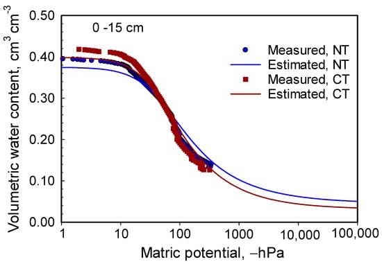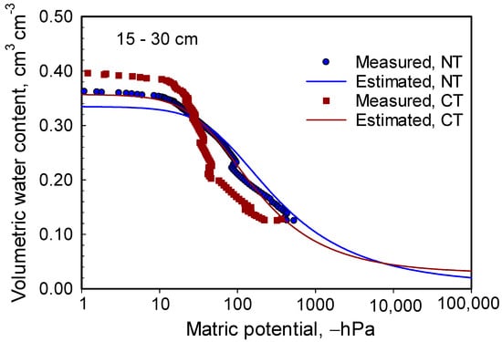 Measured and fitted soil–water retention data for NT and CT at 0–15 cm and 15–30 cm depths are depicted in Figure 1 and Figure 2, respectively. Noticeable differences in soil–water retention curves existed between two tillage systems within each depth. The paired t-test indicated that significant differences were found between α values of the NT and CT estimated SWRC curves at the 15–30 cm depth (Table 1).