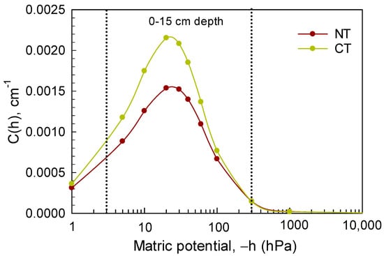 Unimodal pore size distribution showing the slope (C(h)) as a function of matric potential (h) for no-tillage (NT) and conventional tillage (CT) at 0–15 cm soil depth. The dotted lines represent size separation of soil pores.