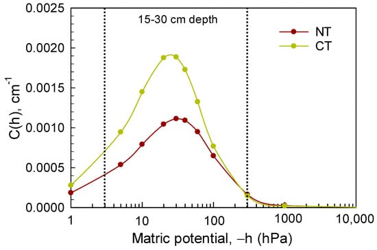 Unimodal pore size distribution showing the slope (C(h)) as a function of matric potential (h) for no-tillage (NT) and conventional tillage (CT) at 15–30 cm soil depth. The dotted lines represent size separation of soil pores.