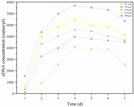 Variation in the A. latus eDNA concentration. Different coloured shapes represent different yellowfin seabream biomasses. The x-axis represents the number of days, and the y-axis represents the eDNA concentrations (copies/μL).