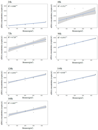 Relationship between the biomass and eDNA concentration of A. latus. Points indicate the data (biomass: 50 g/m3, 150 g/m3, 250 g/m3, 350 g/m3, and 500 g/m3). The eDNA concentrations (copies/μL) as a function of yellowfin seabream biomass (g/m3) at seven sampling time points (24, 48, 72, 96, 120, 144, and 168 h after the yellowfin seabream were introduced to the tanks) are shown. Each data point represents the mean value from three replicates. The grey shaded areas around the regression lines show the 95% confidence interval. R2 values were calculated for each time point separately (*** = p < 0.001).