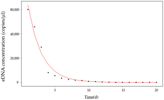 Fitting of the relationship between A. latus eDNA degradation and time. The data points denote the mean eDNA concentration of three replicates. The line represents the exponential decay of eDNA concentration in water with time after the removal of yellowfin seabream.