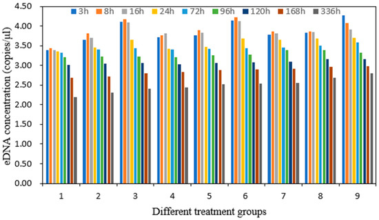 Concentration of eDNA in different treatment groups of yellowfin seabream. The bars represent the mean values of eDNA concentrations, and different colours represent different times.