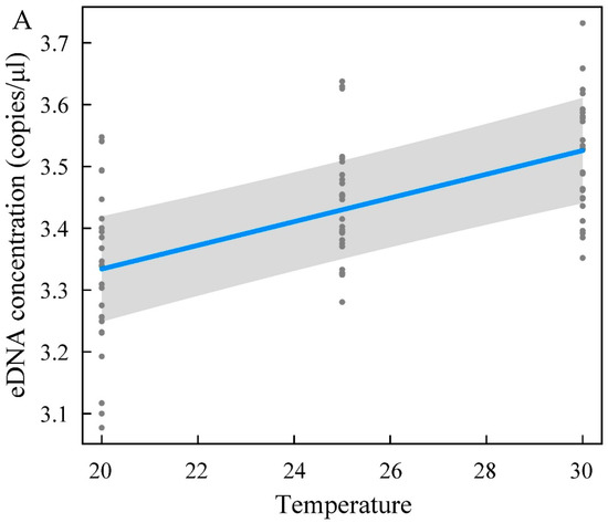 Based on the eDNA concentrations detected in water samples from each treatment group in the experimental factor experiment, we obtained the relationship between different environmental factors and eDNA concentrations, as shown in Figure 5. As shown in Figure 5A, the eDNA concentration of yellowfin seabream increased with increasing temperature (F = 37.253, p < 2 × 10−16). In Figure 5B, the eDNA concentration of yellowfin seabream increased with increasing salinity (F = 27.664, p < 2 × 10−16). As shown in Figure 5C, the relationship between pH and the eDNA concentration of yellowfin seabream was not significant (F = 2.422, p = 0.124 > 0.05).