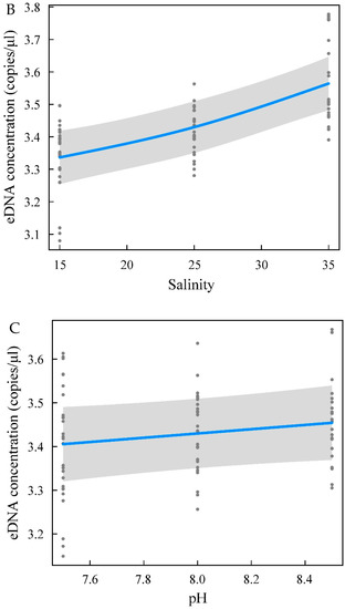 Relationship between different environmental factors and the eDNA concentration of A. latus: (A) Temperature, (B) Salinity, and (C) pH. Each data point represents the mean value of three replicates. The grey shaded areas around the regression lines show the 95% confidence interval.