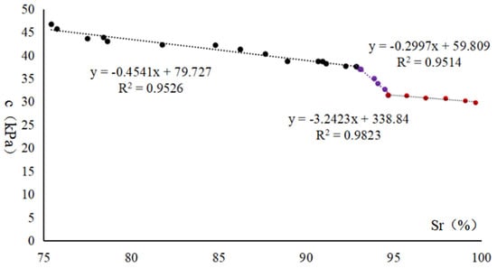 At the landslide site, undisturbed soil samples of shallow expansive soil (main failure layer) are taken through boreholes. The moisture content is measured by the drying method, and the internal friction angle and cohesion c of expansive soil sample is measured by the direct rapid shear test. The relationship between the cohesion c value of the undisturbed sample of the expansive soil and the saturation, Sr, can be obtained by converting the water content into saturation, as shown in the following Figure 1.