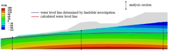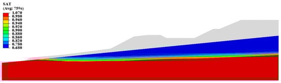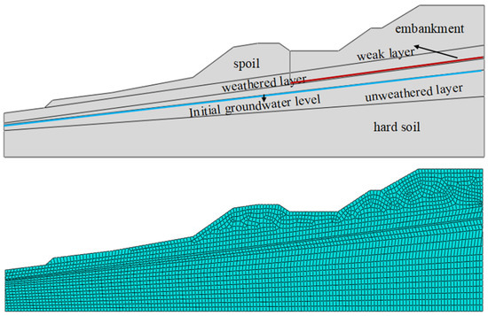 - Initial boundary conditions: before embankment construction, the groundwater level was observed after site leveling and before the rainy season in June 2017. It is located at 3.5–5 m underground. This water level line is set as the initial water level before rainfall. The long-term rainfall in the rainy season corresponds to a process of continuous rise in the groundwater level of the slope. When the groundwater level exceeds the ground during the rise process, it becomes runoff and will not generate excess pore pressure. Therefore, the surface of the slope should be defined as the boundary of pore water pressure-free dissipation. The bottom and both sides of the slope are defined as impervious boundaries to simulate the process of groundwater rise. The long-term rainfall in the rainy season corresponds to a process of continuous rise in the groundwater level of the slope. When the groundwater level exceeds the ground during the rise process, it becomes runoff and will not generate excess pore pressure. Therefore, the surface of the slope should be defined as the boundary of pore water pressure-free dissipation. The bottom and both sides of the slope are defined as impervious boundaries to simulate the process of groundwater rise.