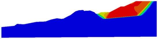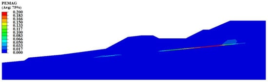 Figure 7 shows the plastic strain zone of the slope. Under the action of fill load, a large plastic deformation zone appears at the position of the weak layer. The abnormal stress field appears in the weak layer, and the further sliding fragmentation of the weak layer, under the action of local stress concentration, finally forms the sliding surface. It can be seen that the stress change caused by filling soil load has a certain impact on the development of weak layers.