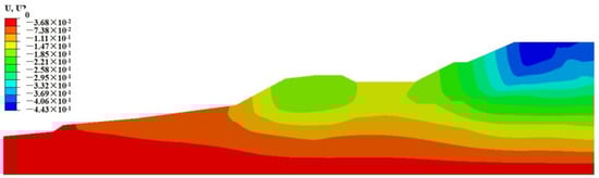 It can be seen from the overall displacement of the slope, in Figure 8, that the area with large vertical displacement is located at the crack on the top of the slope, and the Embankment Filler, on both sides of the crack, has a large relative dislocation. The horizontal displacement mainly occurs near the weak layer, indicating that the soil layer on the upper side of the weak layer has a large bedding displacement. The area with large lateral displacement is close to the plastic area. According to the above analysis, the stress change caused by the embankment-filling load has a certain impact on the development of the weak layer. Under the load, it has a horizontal displacement and further fragmentation, finally forming a sliding surface.