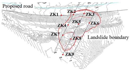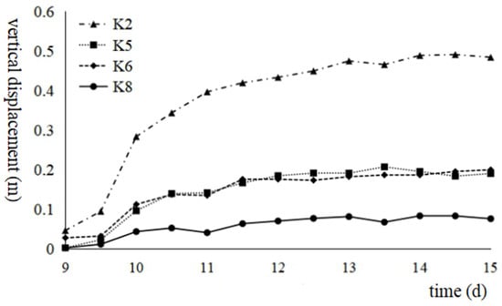 After the vertical tension cracks appear on the top of the embankment, ZK1–ZK9 observation points are set on the site (Figure 9), which are respectively arranged at the upper, middle, and lower positions of the landslide for monitoring the vertical displacement of the slope. The settlement displacement of representative slope displacement monitoring points ZK2 (top of slope), ZK5 and ZK6 (middle of slope), as well as ZK8 (toe of slope) is shown in the following Figure 10. With the expansion of vertical cracks, the settlement increases rapidly in the initial stage and gradually stabilized in the later stage. The monitoring data was stopped after the 15th. According to the monitoring results, the settlement value of the rear edge of the landslide is large, while the change of the front edge is not obvious.