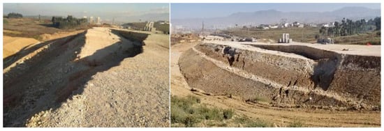 The landslide is located in Baoshan City, Yunnan Province, and it belongs to a gentle slope and hilly landform with gentle terrain. The rainfall is concentrated in the rainy season from June to September. The designed filling height of embankment is 16 m. The construction period just passes through the local rainy season, and cracks occur on the top surface of the subgrade when the filling reaches 12 m, with an initial joint width of 1–2 mm. The construction unit did not take treatment measures to continue the construction, and the embankment deformation increased suddenly. Two days later, the upper edge crack increased to 30 cm, and the top of the embankment sank, with a sinking amount of 30–40 cm. In the next five days, the top of the embankment sank by 1.6 m, as shown in the Figure 4 below.