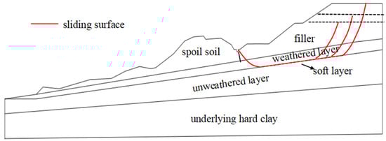 The calculation results are as follows in Table 5. Without considering moisture absorption and softening, the calculated stability coefficient is 1.15, indicating that the slope is in a stable state. After considering the moisture absorption and softening, the stability coefficient of the slope decreases to 0.97, and the filling section has been in an unstable state. The lower sliding surface passes through the weak layer, and the rear edge of the landslide is located in the middle of the pavement, between the filling area and the spoil area at the front edge of the landslide, as shown in Figure 11. From the distribution of the plastic zone (Figure 8), it can be seen that the weak layer forms a stress concentration zone under the action of the upper embankment load, forming a broken line plastic zone along the weak layer inside the slope, resulting in tensile cracks in the filling area and causing the overall instability of the slope. Compared with the field picture (Figure 12), it can be found that the calculated landslide shape is relatively close to the actual situation, which is in line with the actual situation of slope instability under the surcharge height. According to the calculation results of the sliding surface and stability coefficient, the modeling method and parameter used in this paper are reasonable.